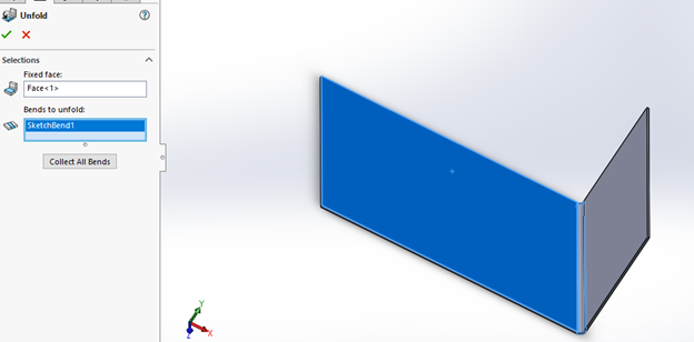 حال اگر این sketched bend را تایید کنیم در سمت راست جعبه ابزار sheet metal دو گزینه fold و unfold را مشاهده میکنیم که اگر روی گزینه unfold بزنیم، در کادر اول، ابتدا صفحه ای که ثابت میماند را مشخص میکنیم و در کادر دوم تا یا خمی که باید به صورت flatten در بیاید را مشخص میکنیم: