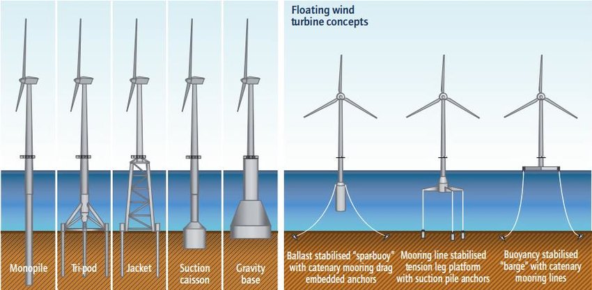 همانند سکوهای نفتی، توربینهای بادی فراساحلی نیز به دو دستۀ ثابت و شناور تقسیم میشوند. توربینهای ثابت برای عمقهای کمتر از هفتاد_هشتاد متر استفاده شده که بر اساس نحوۀ قرارگیری بر بستر دریا به پنج نوع مونوپایل(Monopile)، ترایپاد(Tripod)، جکت(Jacket)، صندوقه هوا(Suction caisson) و ثقلی(Gravity base) تقسیم میشوند. توربینهای شناور نیز انواع مختلفی دارند و تفاوت آنها در شکل پایه و نحوۀ اتصالشان به بستر دریا است.