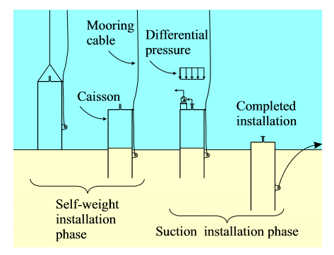 صندوقۀ هوا(Suction caisson): صندوقههای هوا مخازنی سنگین و خالی هستند که ابتدا تحت وزن خود در بستر دریا رها میشوند و تا عمق مشخصی در خاک فرو میروند. سپس برای تثبیت آنها، شیر بالای مخزن را باز کرده و آب واردشده را تخلیه میکنند تا داخل آنها خلا ایجاد شود و بیشتر در خاک بستر فرو بروند.