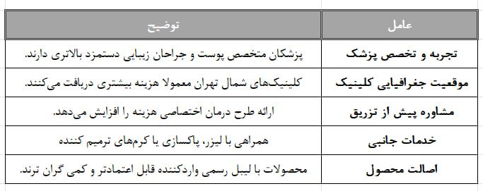 کلینیکهای واقع در مناطق لوکستر یا شمال شهر تهران، اغلب خدمات با قیمت بالاتری ارائه میدهند. این موضوع نه تنها به خاطر اجاره یا هزینههای عملیاتی بالاتر است، بلکه به خاطر نوع مشتریانی است که انتظار خدمات سطح بالا دارند.