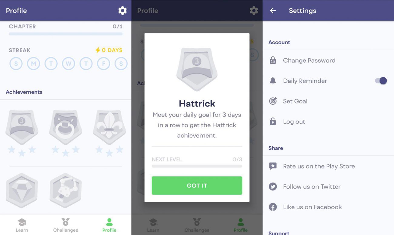 و اما در صفحه سوم میزان پیشرفت خود و نشانهایی را که از میمو دریافت کردهاید، مشاهده خواهید کرد. همچنین از این صفحه میتوانید وارد قسمت تنظیمات اپلیکیشن شده و تنظیمات دلخواه خود را مانند ایجاد یادآور، هدفگذاری و… را اعمال کنید.