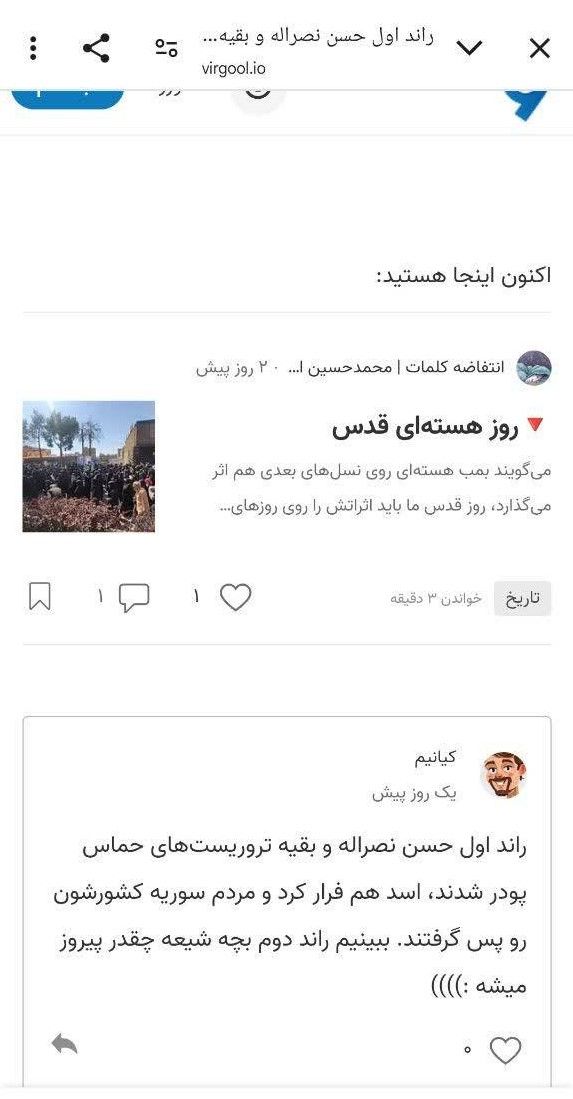 🔺 اسرائیل جشن پوریم راه می اندازد و به محضر آمریکا هم مشرف می شود که ایرانیانِ شیعه را قتل عام می کنم. اما در جهان از هر رنگ و مذهبی به فارسی شعار می دهند، عکس تحریم شدهترین رهبر جهان را سر دست می گیرند، بسیج آمریکا را افتتاح می کنند. ایران اگر تا دیروز جایی در غرب آسیا بود امروز در تمام آسیا و آفریقا و آمریکا ظهور کرده است.
