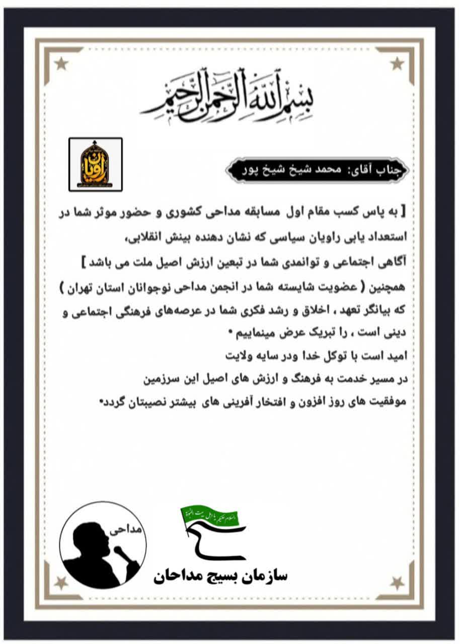 به پاس کسب مقام اول مسابقه مداحی کشوری و حضور موثر شما در مسابقات راویان سیاسی که نشان دهنده بینش انقلابی آگاهی و اجتماعی و توانمندی شما و تبیین ارزش های ملت اصیل ایران میباشد ●