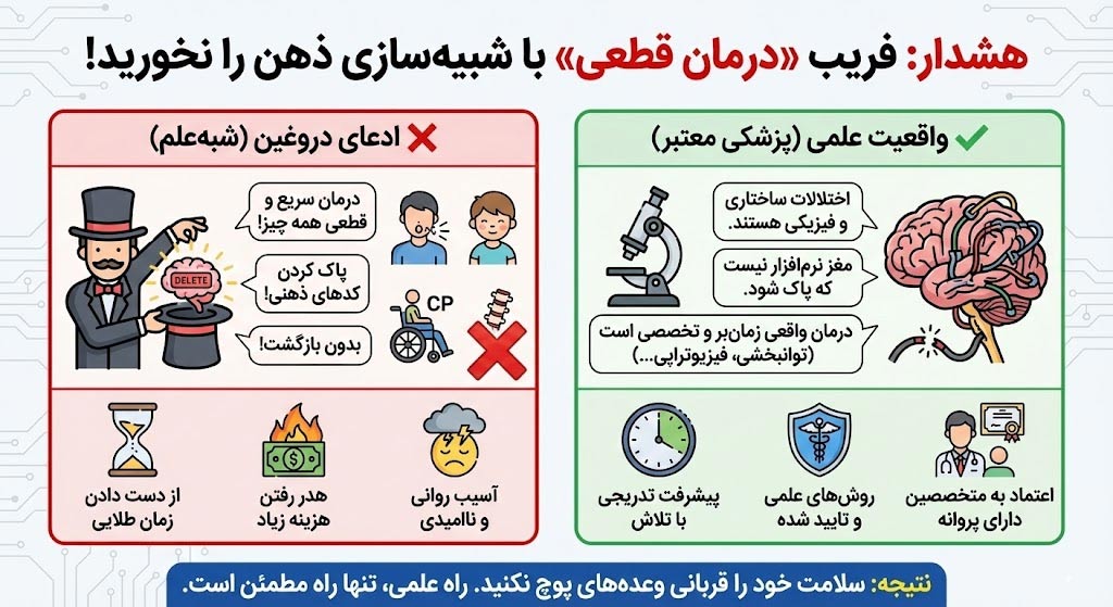 از دست دادن «زمان طلایی»: در اوتیسم و فلج مغزی کودکان، مغز در سنین پایین (زیر ۵ سال) بیشترین انعطاف را دارد. اگر این زمان طلایی صرف روشهای دروغین شود، کودک شانس توانبخشی واقعی را برای همیشه از دست میدهد.