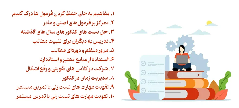 با بهکارگیری این روشها و توصیهها، میتوانید به موفقیتهای بزرگی دست یابید. به یاد داشته باشید که تلاش مستمر، پشتکار و استفاده از تجربیات رتبههای برتر، کلیدهای موفقیت در کنکور هستند.