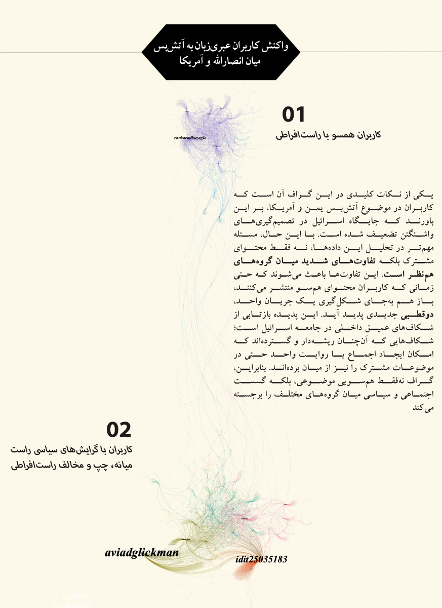 در عین حال، غیبت معنادار بازیگران رسانهای اصلی، رهبران فکری و جریانهای مرکزی در این میدان و جایگزینی آنها با کاربران حاشیهایتر، بهویژه حسابهای راستافراطی و حریدی، خود گواهی است بر بحران بازنمایی و انفعال آگاهانه جریان رسمی در برابر این ضربه ژئوپلیتیکی. این غیبت ممکن است ناشی از عمق آسیبپذیری رژيم صهیونیستی در این رویداد و ناتوانی آن در ارائه روایتی دفاعپذیر باشد. از منظر تحلیل شبکهای، دو قطبی شکلگرفته نهتنها نشانهی اختلافنظرهای سیاسی یا ایدئولوژیک است، بلکه بیانگر فروپاشی ظرفیت ارتباطی میان گروههای اجتماعی رژیم است.