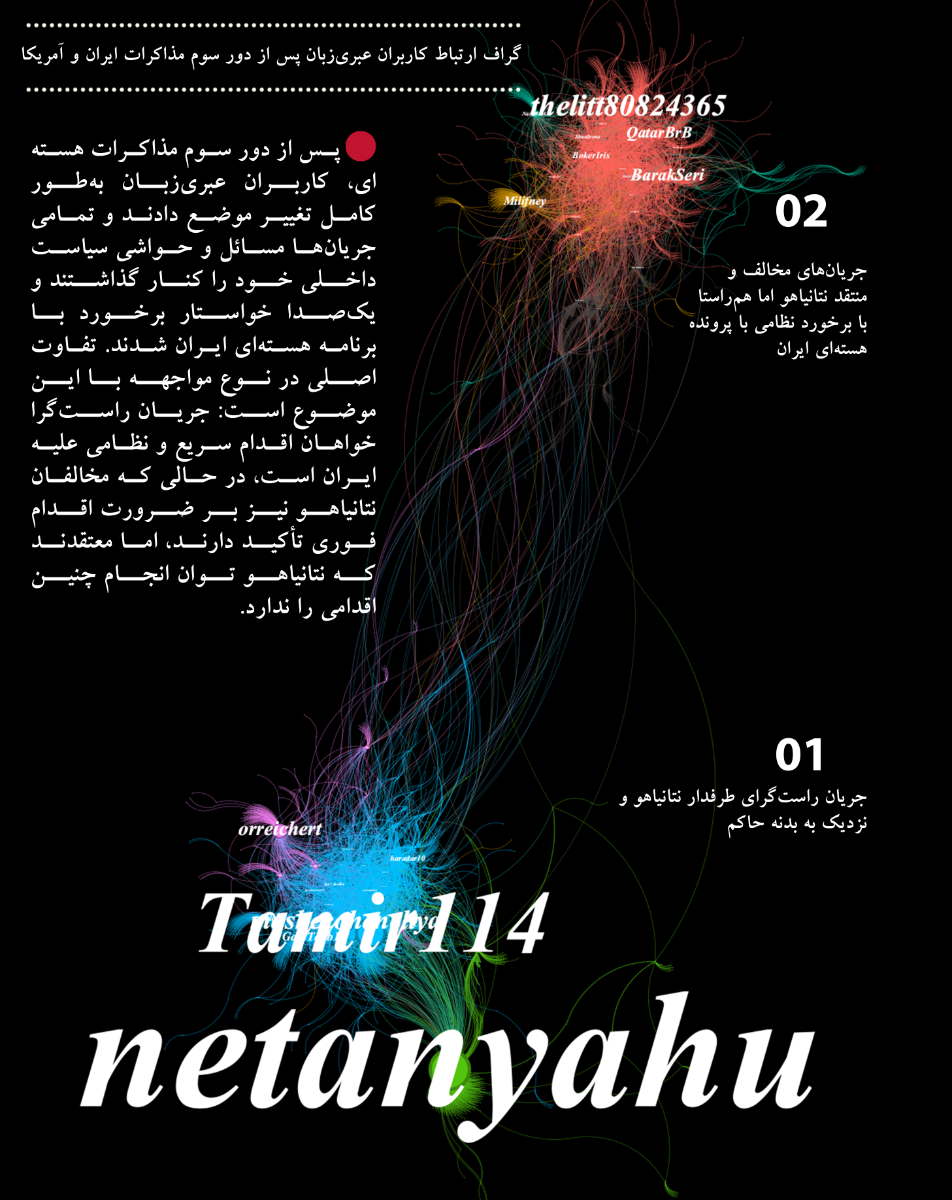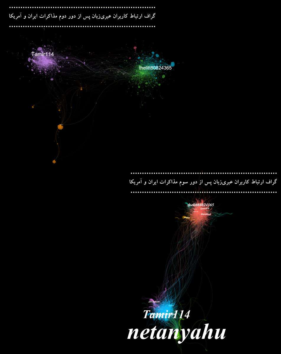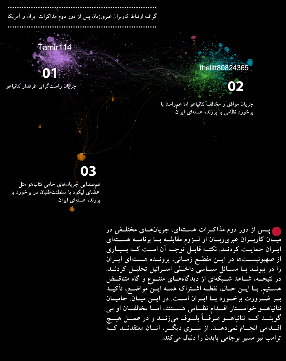 در مجموع، محتوای عبریزبان پیرامون مذاکرات دور دوم حاکی از همراستایی میان صهیونیستهاست: لزوم مقابله جدی با ایران اما نکته قابل توجه این است که اختلافات داخلی در این برهه از زمان باعث تشتت صهیونیستها در این پرونده شده است و همانطور که در گراف دوم مشهود است با اینکه دوقطبی ایجاد شده است اما قطبها به صورت منسجم و متمرکز نیستند و اختلافات داخلی مانع از همراستایی بدنه صهیونیستها شده است.