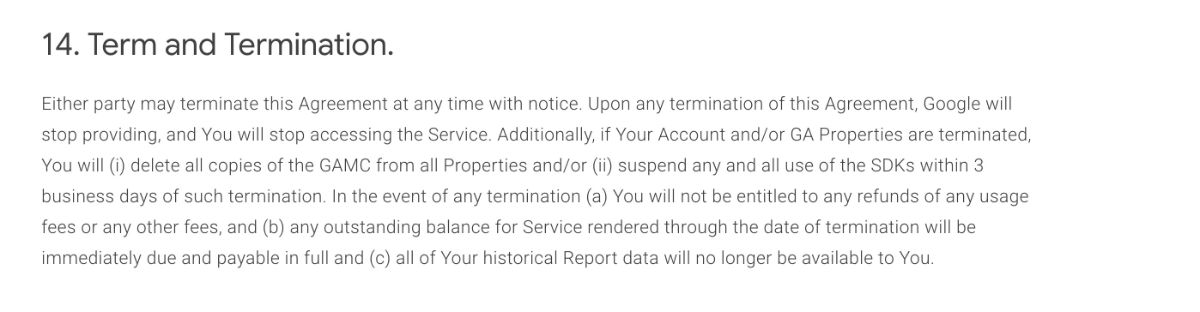 بر اساس متن بخش ۱۴ مقررات استفاده از سرویس گوگل آنالیتیکس، هریک از طرفین (گوگل و کاربر) میتوانند در هر زمان که بخواهند به این همکاری دوطرفه پایان دهند. به همین ترتیب، گوگل در هر زمان، حق آن را دارد که دسترسی شما به اکانت را قطع و از ارائه خدمات به شما خودداری کند و تمام دادههای شما را ظرف ۳ روز کاری از بین ببرد! در این صورت، هیچ بازگشت هزینه و جبران خسارت نیز در کار نخواهد بود.