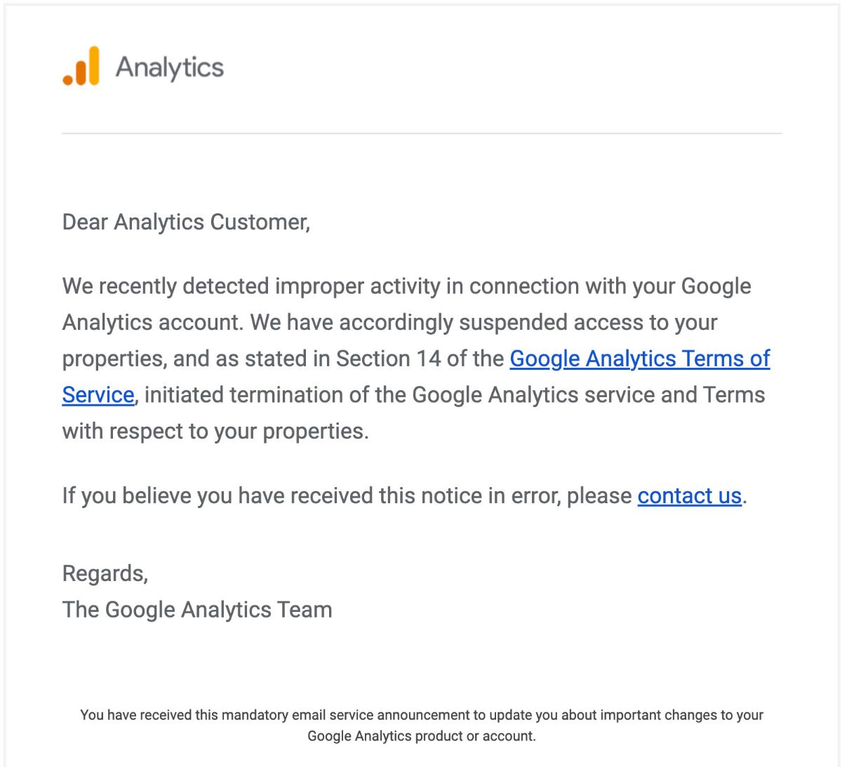 اخیرا ما متوجه رفتار نامتناسب شما در ارتباط با اکانت آنالیتیکس شدهایم. به همین دلیل، دسترسی شما به داراییها [ذیل این اکانت] را به حالت تعلیق درآوردیم. همانطور که در بخش ۱۴ مقررات استفاده از سرویس گوگل آنالیتیکس توضیح داده شده، پایان خدمات گوگل آنالیتیکس به شما را اعلام میکنیم.