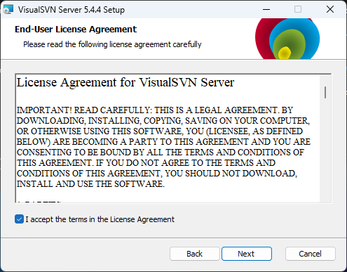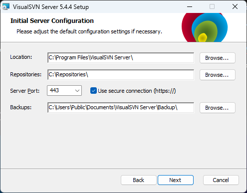 تقریبا این قسمت از نصب svn server مهم ترین قسمت در نصب این نرم افزاره. گزینه Location از شما مسیر نصب نرم افزار svn server رو میخواد. قسمت دوم یعنی Repositories محل ذخیره شدن Repository های شمارو میخواد که بهتره جایی به جز درایوی که ویندوز روی اون نصب هست انتخاب بشه، چون در صورت خراب شدن ویندوز، ریپازیتوری های شماهم ممکنه پاک بشه. در قسمت سوم یعنی Server Port مشخص میکنه که برای دسترسی به svn server از طریق چه پورتی متصل بشید. و Backups هم که همونجور که از اسمش مشخصه، محل ذخیره سازی بکاپ های ریپازیتوری ها برروی سرور رو مشخص میکنه. بعد از انجام تنظیمات بالا، برروی گزینه Next کلیک کنید.