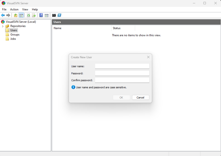 در پنجره باز شده در قسمت User name، نام کاربری ای رو انتخاب میکنیم که میخوایم User مورد نظر از طریق آن لاگین رو انجام بده. و در قسمت Password و Confirm password، رمز عبور و تکرار رمز عبوری که کاربر قراره با اون لاگین رو انجام بده رو وارد میکنیم.