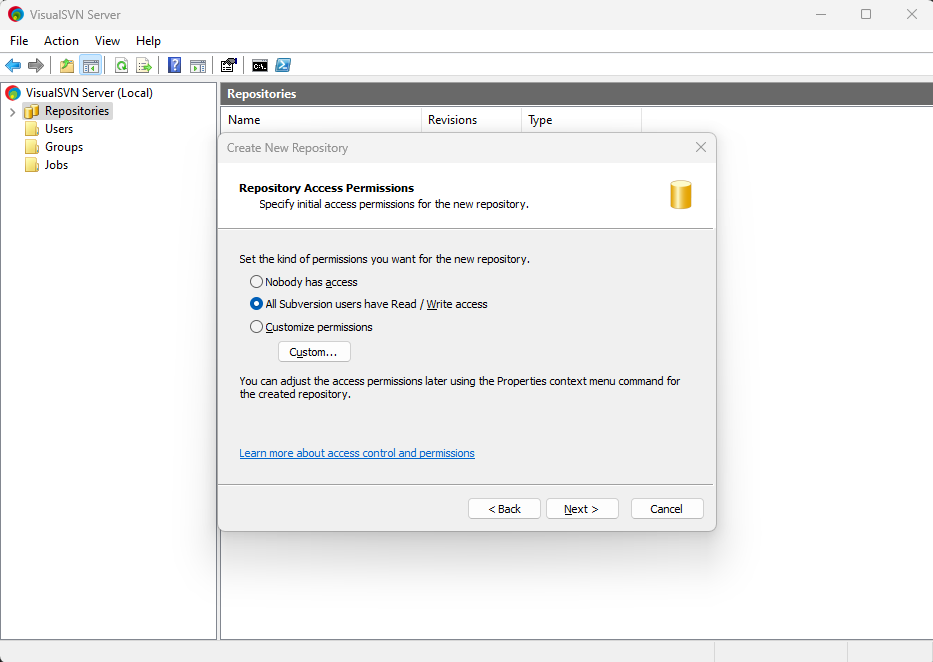 در گزینه سوم Custom... شما میتونید از بین User ها مشخص کنید که چه کاربری به Repository دسترسی داشته باشه.