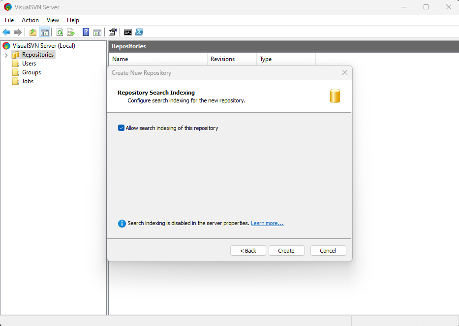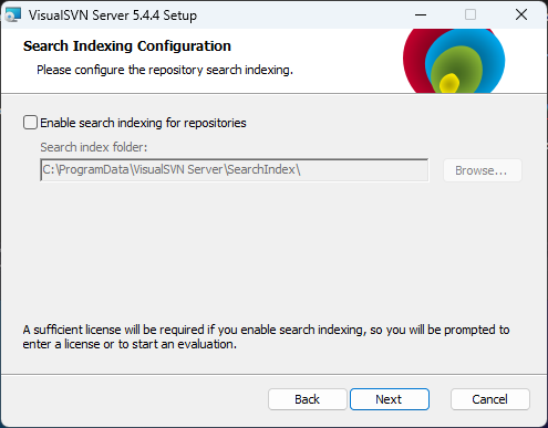 در اینجاهم تیک Enable search indexing for repositories رو نمیزنیم چون index گزاری repository ها به درد جاهایی میخوره که قراره در مقیاس بزرگ از این SVN استفاده شود و همچنین برای فعال کردن این گزینه نیاز به لایسنس دارید که خب ما نمیخوایم لایسنس بخریم و میخوایم از امکانات رایگان اون استفاده کنیم.