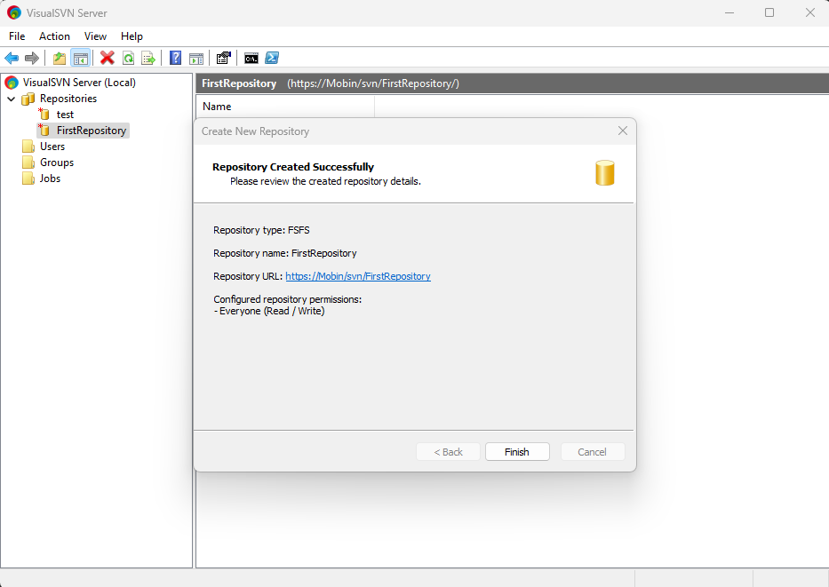 در اینجا، به شما یک Repository URL به شما میده که از این به بعد میتونید از طریق این URL به Repository مورد نظرتون دسترسی داشته باشید. حالا برروی Finish کلیک کنید و خلاصصصصصصصصصص.