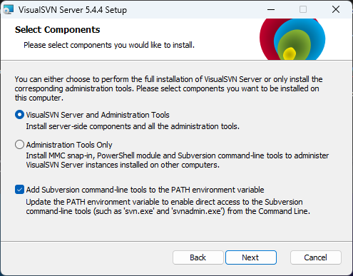 تیک گزینه اول رو میزنیم و اگه میخوایم بعد از نصب شدن svn server ابزار استفاده از اون در command line رو هم داشته باشید، گزینه آخر رو هم فعال کنید. منظور از ابزار ها همون دستورات svn checkout و svn commit و از این قبیل دستورات برای کار با svn است.