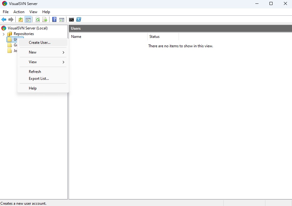 برای ایجاد User، از پنجره سمت چپ برروی Users کلیک راست میکنیم و در پنجره باز شده برروی Create User... کلیک میکنم.