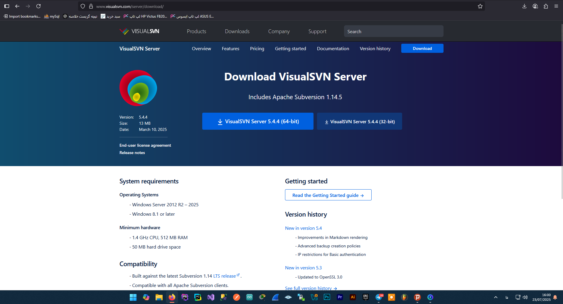 ابتدا وارد سایت visualsvn شوید و VisualSVN Server مناسب با معماری خودتون رو دانلود کنید. من چون معماری کامپیوتری که میخوام svn رو راه اندازی کنم 64 بیتی هست، 64 بیت رو دانلود میکنم.