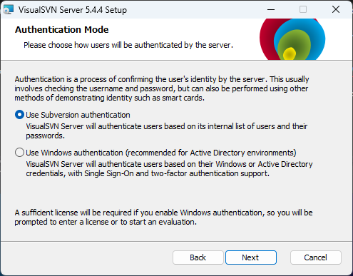 در این قسمت هم مشخص میکنیم که اهراز حویت کاربرانی که میخوان از این سیستم استفاده کنند باید به چه صورتی باشه که ما گزینه اول رو انتخاب میکنیم که بتونیم داخل SVN یوزرهای مختلف رو خودمون برای کاربرها تعریف کنیم و بعد بروی گزینه Next کلیک میکنیم.