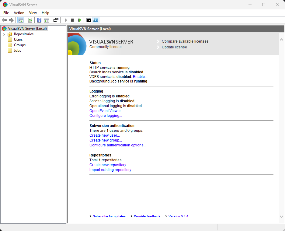 بعد از نصب شدن پنل مدیریتی SVN به شما نمایش داده خواهد شد. که پنجره سمت راست قسمت Status باید شما HTTP service is running را مشاهده کنید. به این معنا که SVN Server شما درحال اجرا است.