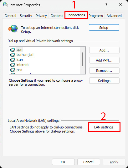 برای این کار کافیه بدونید پروکسی ای که ساختید روی چه پورتی به شما گوش میده. برای این کار وارد Internet Option شوید و از منوی بالا گزینه Connections رو انتخاب کنید.