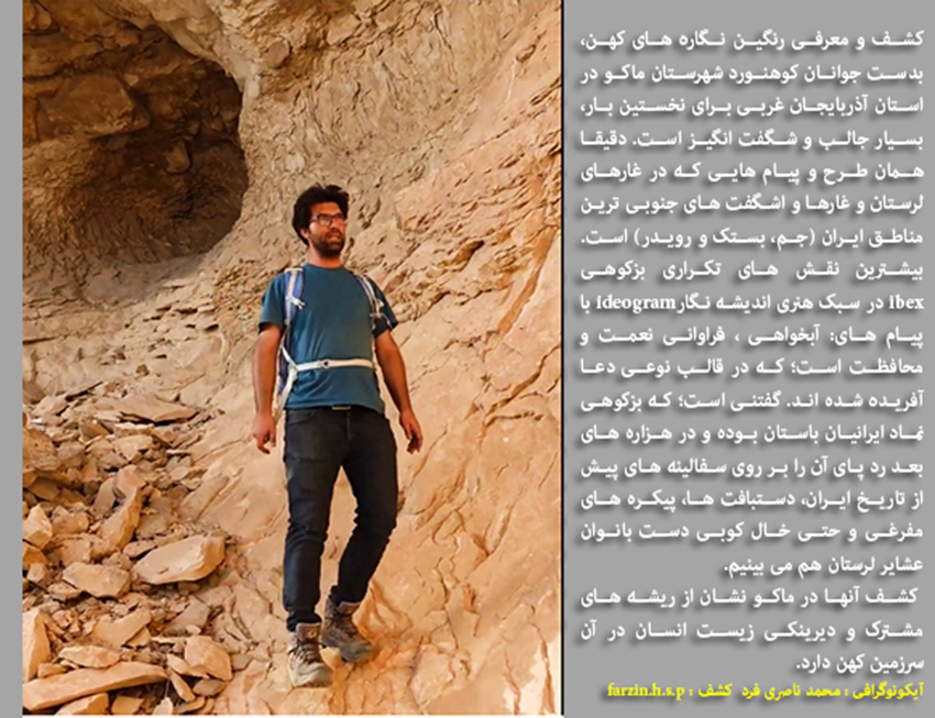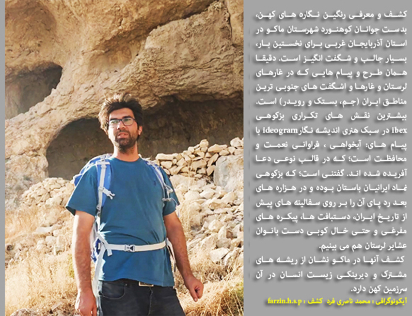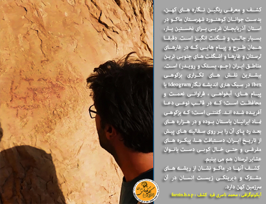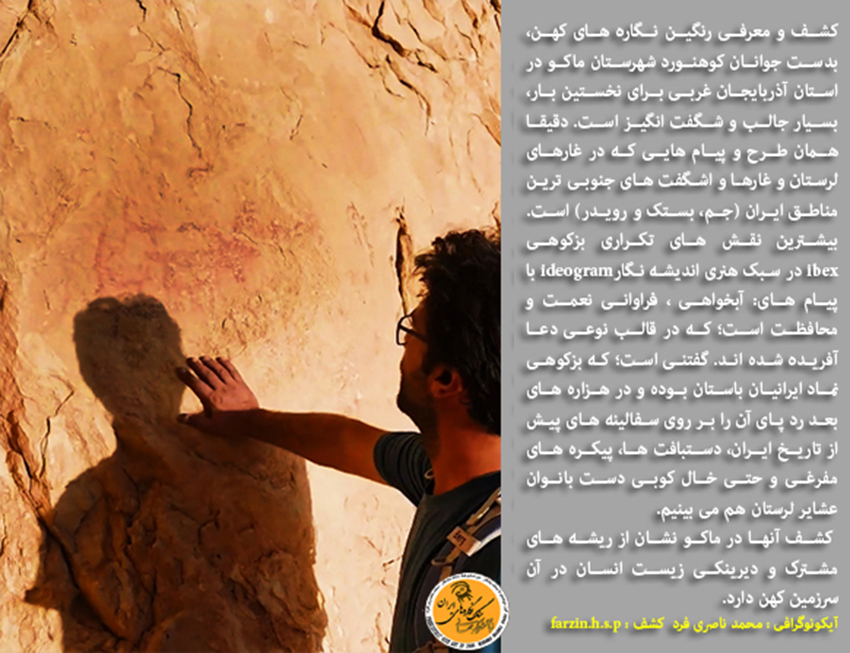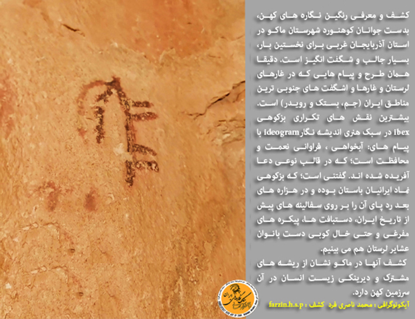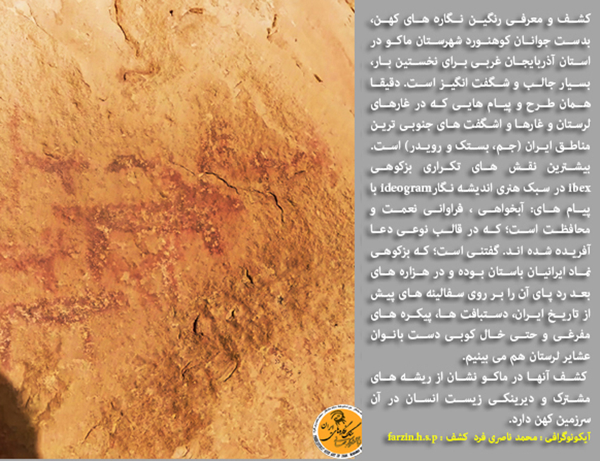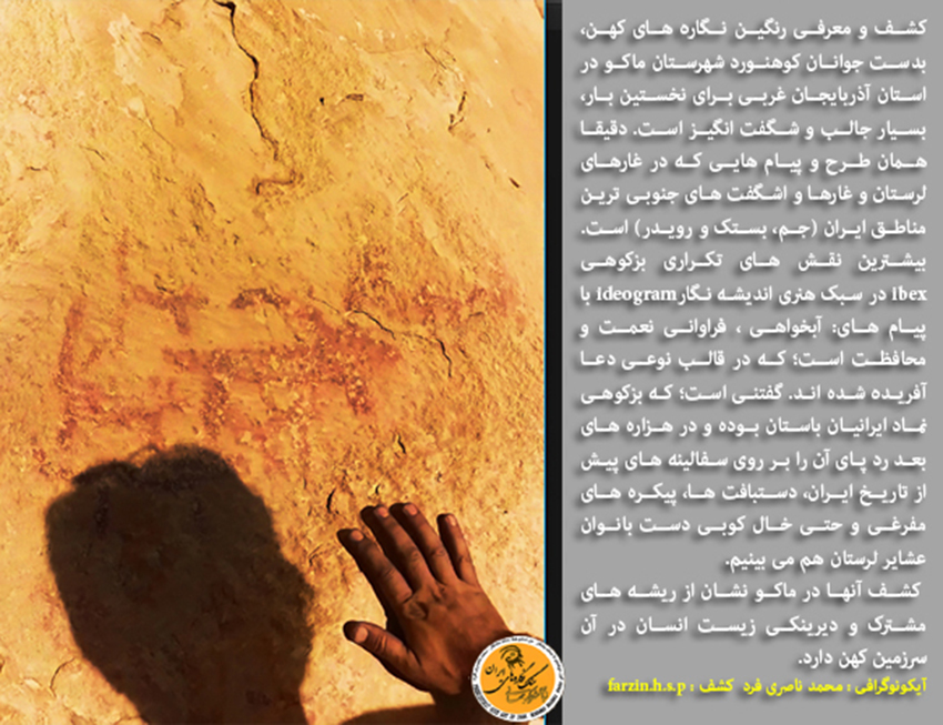 کشف و معرفی رنگین نگاره های کهن، بدست جوانان کوهنورد شهرستان ماکو در استان آذربایجان غربی برای نخستین بار، بسیار جالب و شگفت انگیز است. دقیقا همان طرح و پیام هایی که در غارهای لرستان و غارها و اشگفت های جنوبی ترین مناطق ایران (شهرستان جم، بستک و رویدر) است. بیشترین نقش های تکراری بزکوهی ibex در سبک هنری اندیشه نگارideogram با پیام های: آبخواهی، فراوانی نعمت و محافظت، که در قالب نوعی دعا آفریده شده اند. گفتنی است؛ که بزکوهی نماد ایرانیان باستان، بویژه ایلام کهن بوده؛ که نمونه ی برجسته ی مورد اشاره آن طرح بزکوهی دم هومه (Ephedra)،در پیام درخت درخت مانایی است؛ که با هنری بی نظیر، بر روی جام شوش جلوه گری می کند و تاکنون کسی آن اعجاز هنری را ندیده است؛ چرا که مضمون و پیام آن اثر هنری مسحور کننده(طرح بزکوهی در قالب نوعی خط تصویری) نامکشوف بوده است. رد پای آن نماد کهن (The ibex Code) را در هزاره های بعد فراوان بر روی سفالینه های پیش از تاریخ ایران، دستبافت ها، پیکره های مفرغی و حتی خالکوبی دست بانوان عشایر لرستان هم می بینیم.