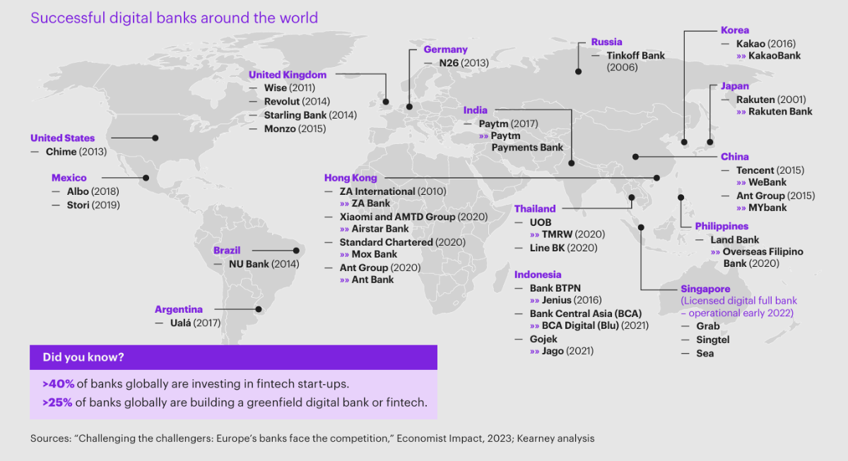 نئوباک Nubank یک بانک دیجیتال که در سال ۲۰۱۳ تأسیس شده و دفتر مرکزی آن در سائوپائولو برزیل است، نمونهای خوب از مزیت رقابتی نئوبانکها ارائه میدهد. ده سال پیش، وقتی صحبت از بهرهگیری از فناوری و دیجیتال به میان میآمد، بیشتر بانکهای سنتی نوآور به ایجاد شتابدهندهها یا برنامههای انکوباتور داخلی فکر میکردند. رویکرد دیجیتالمحور تفاوت چشمگیری با شیوه عملکرد بسیاری از بانکهای سنتی دارد. این بانکها اغلب بر سیستمهای قدیمی پیچیده، با عملکردهای جزیرهای و بدون یکپارچگی بین کانالهای دیجیتال و فیزیکی خود متکی هستند. در این شرایط، بسیاری از بانکهای سنتی برای رقابت با نئوبانکها تلاش میکنند و به دنبال بهبود خدمات دیجیتال خود هستند. ۲۵ درصد از بانکها در حال ساخت یا فعالانه به دنبال ایجاد یک بانک دیجیتال یا فینتک جدید هستند.
