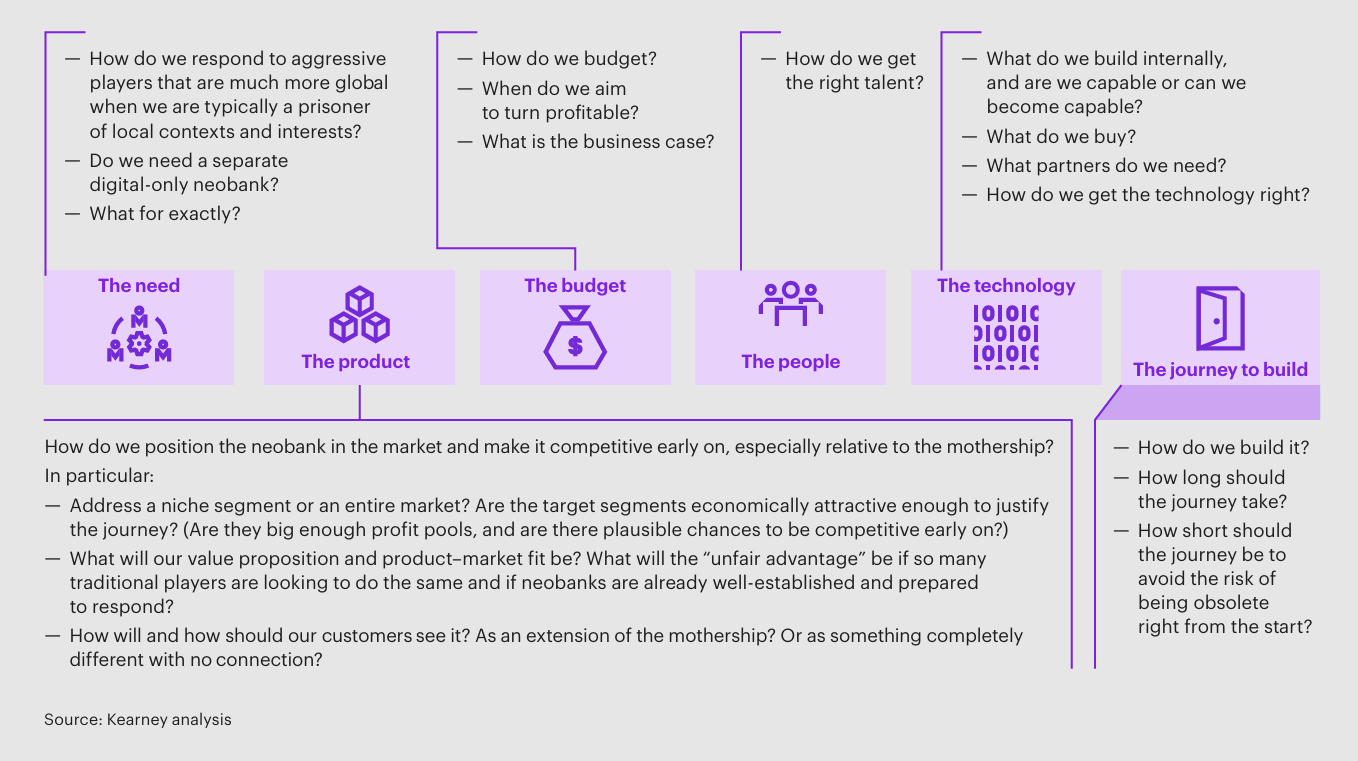 در حالی که خرید نئوبانکها میتواند فناوری، نوآوری و استعدادهای جدیدی را به بانک بیاورد، هماهنگسازی این قابلیتها با عملیات، فرهنگ و اهداف استراتژیک بانک چالشی جدی محسوب میشود. برای راهاندازی یک نئوبانک، مدیران عامل باید به دهها سؤال استراتژیک پاسخ دهند تا مشخص شود چرا و چگونه باید چنین پروژهای را آغاز کنند.