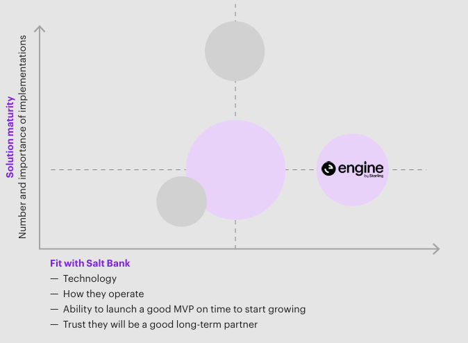 انتخاب فناوریهای مناسب و شناسایی شرکای ایدهآل برای پروژه نیز دشوار است. در طی فرآیند ارزیابی دقیق که حدود سه ماه به طول انجامید، ارائهدهندگان جدیدی با مدلهای معماری متنوع معرفی شدند تا گزینههای فناوری موجود برای بانک Salt بهطور جامع بررسی شوند. در این فرآیند، شرکت Kearney چارچوبهای دقیقی برای ارزیابی فناوریهای بانکی ارائه داد که به شناسایی و بررسی اجزای کلیدی معماری فناوری اطلاعات بانک کمک کرد. این رویکرد به بانک Salt امکان داد تا فرآیند ارزیابی را به صورت ساختاریافته و هدفمند پیش ببرد. همزمان با ارزیابی ارائهدهندگان توسط هیئتمدیره بانک، تیم اطمینان حاصل کرد که توسعه پروژه بهمحض انتخاب ارائهدهنده فناوری، آماده آغاز باشد.