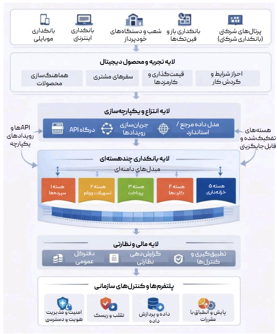 هسته بانکی چندگانه بر این فرض بنا شده که هسته بهعنوان یک مفهوم عملیاتی و مالی همچنان ضروری است، اما تمرکز و یکپارچگی آن باید شکسته شود. در این رویکرد، بانک بهجای تکیه بر یک هسته واحد، از چند هسته تخصصی و مستقل استفاده میکند که هرکدام مسئول یک دامنه مشخص کسبوکار هستند. برای مثال، سپردهها، تسهیلات، پرداختها، کارت و خزانهداری میتوانند هرکدام هسته جداگانه خود را داشته باشند. این هستهها از طریق لایههای میانی استاندارد مانند API Gateway، معماری رویدادمحور و مدل داده مرجع با یکدیگر و با کانالهای بیرونی ارتباط برقرار میکنند. در چنین معماری، هسته حذف نمیشود، بلکه به اجزای کوچکتر، مستقلتر و قابلجایگزینی تقسیم میشود؛ اجزایی که میتوانند با سرعتهای متفاوتی تکامل پیدا کنند.