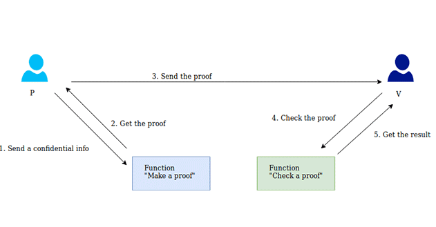 P اطلاعات رازی را به عنوان یک آرگومان به یک تابع خاص - “ساخت یک اثبات” - میگذراند (تصویر زیر را ببینید). خروجی مقداری از “اثبات” است. پس از آن، P “اثبات” را به کاربر V میفرستد. سپس، V میتواند با استفاده از “اثبات” و یک تابع خاص دیگر - “بررسی یک اثبات” - بررسی کند که آیا P اطلاعات رازی را میداند یا خیر.