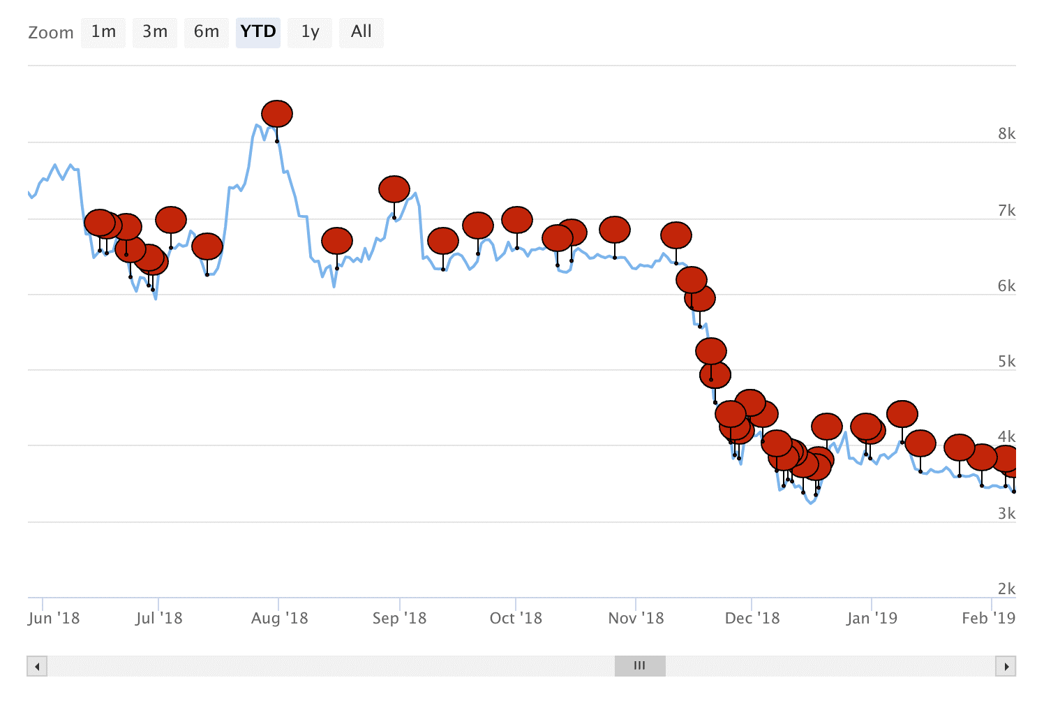 طی سال ۲۰۱۸، در زمانهای سقوط قیمتهای عمده، افزایش دورهای در مقالات انتقادی رخ داد. تعداد مقالات ترحیم بیتکوین در نوامبر - دسامبر ۲۰۱۸، زمانی که قیمت به زیر ۴,۰۰۰ دلار سقوط کرد، به اوج خود رسید. در این نقطه، نگرانیها در مورد امکانپذیری بیشتر توسط نوسانات تا افزایش توجه رانده میشدند.