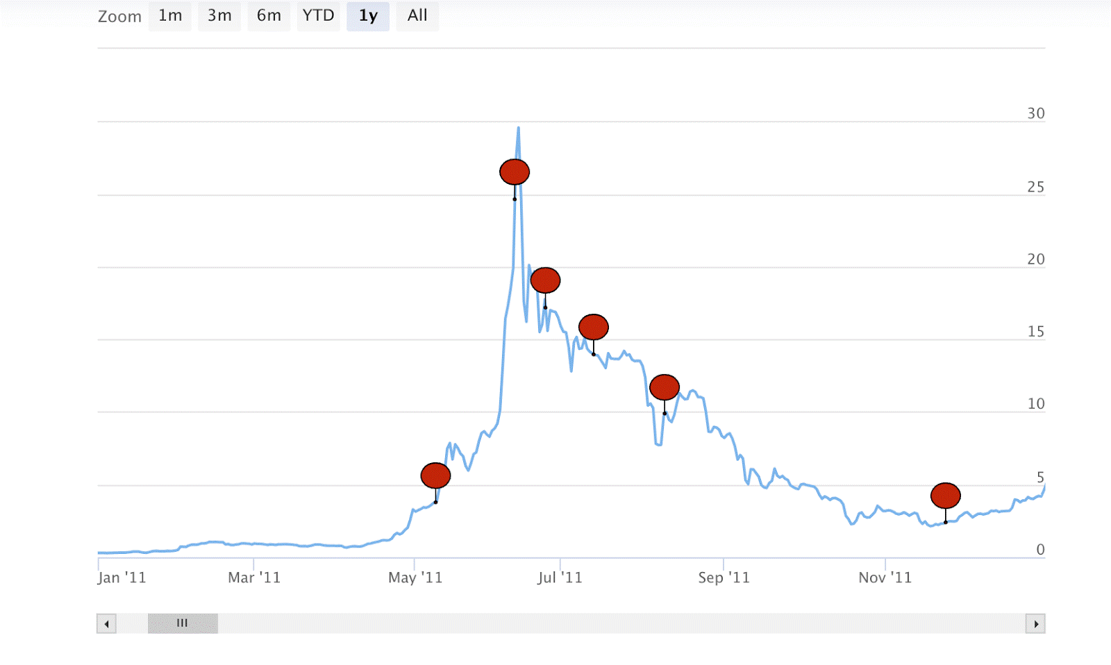 در ماههایی که دقیقاً قبل از نصف شدن بودند (سپتامبر - اکتبر ۲۰۱۲)، هیچ مقاله انتقادی وجود نداشت. قیمت نسبتاً پایدار حول و حوش ۱۰-۱۵ دلار باقی ماند.
