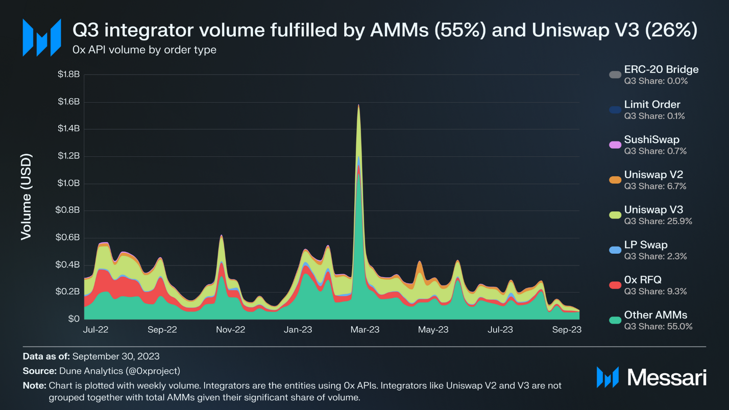حجم خدمات ارائه شده توسط APIهای ۰x در سهماهه سوم، ۳۳% کاهش یافته است، از ۴ میلیارد دلار به ۲.۷ میلیارد دلار. بزرگترین کاهشها در تکمیل سفارشات از Uniswap (۴۹%-)، ۰x RFQ (۲۸%-)، و سایر AMMها (۱۹%-) بوده است. با این حال، سهم حجم نسبت داده شده به تکمیل AMM از ۴۶% به ۵۵% در سهماهه به سهماهه افزایش یافته است. اضافه شدن مداوم منابع نقدینگی جدید ممکن است منجر به افزایش بیشتر حجم شود وقتی فعالیت بازار به رمزنگاری بازگردد، حتی در مقایسه با سهماهههای پیشین که عملکرد خوبی داشتند.