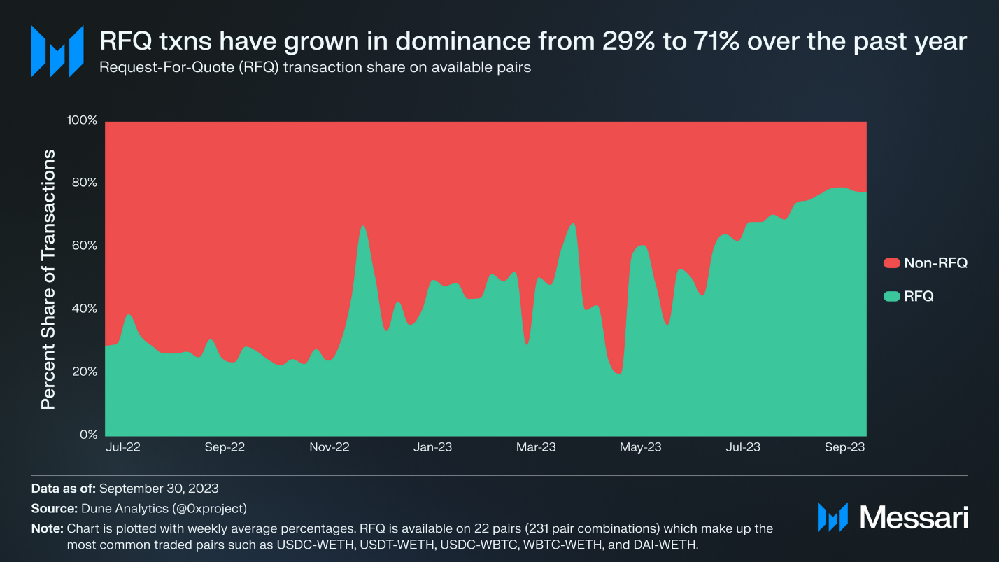 در ۰x، نقدینگی خارج از زنجیره از بازارسازان حرفهای از طریق سیستم درخواست برای نقل قول (RFQ) تأمین میشود. سیستم RFQ به معاملهگران اجازه میدهد تا نقل قولهای لحظهای را از بازارسازان درخواست کنند. با استفاده از سیستم RFQ، معاملهگران میتوانند از لغزش قیمت جلوگیری کنند، خطر حملات MEV را کاهش دهند و اطمینان حاصل کنند که اجرای معامله بهینهسازی شده است. RFQ در جفتهای غیر-ثابت بهترین عملکرد را دارد، از جمله برخی از پرمعاملهترین جفتها مانند USDC-WETH، USDT-WETH، USDC-WBTC، WBTC-WETH و DAI-WETH. در طول سال گذشته، معاملات RFQ به تسلط بر فعالیتهای ۰x در جفتهایی که در دسترس هستند رسیدهاند، از ۲۹% در سهماهه سوم ۲۰۲۲ به ۷۱% در سهماهه سوم ۲۰۲۳ افزایش یافته است. این نشاندهنده چهار سهماهه متوالی رشد است. در هر شرایط بازاری، کاربران برای معاملاتی که اقتصادیتر هستند و از خطرات لغزش قیمت/MEV اجتناب میکنند، ترجیح خواهند داد.
