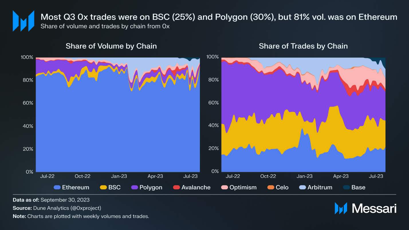 · Polygon و BNB Smart Chain (BSC) همچنان در سهماهه سوم، بیش از Ethereum در معاملات ۰x نقش داشتند، به ترتیب ۳۰% و ۲۵% از کل معاملات را به خود اختصاص دادند. در همان زمان، Ethereum همچنان بیشترین سهم حجم را با ۸۱% در دست داشت.