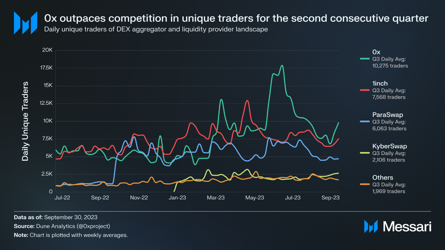 برای دومین سهماهه متوالی، ۰x به طور میانگین بیش از ۱۰,۰۰۰ معاملهگر منحصر به فرد روزانه جذب کرد، و از رقبای خود در زمینه تجمیعکنندههای DEX و ارائهدهندگان نقدینگی پیشی گرفت. در سهماهه دوم، بیشتر بازار شاهد رشد در تعداد معاملهگران منحصر به فرد روزانه بود. ParaSwap ۲۳% افزایش داشت، سایر پروتکلها ۳۱% جهش کردند، و ۰x با ۷۱% افزایش یافت. با این حال، در سهماهه سوم، کل بازار شاهد کاهش ۵% در تعداد معاملهگران منحصر به فرد روزانه بود، با این حال ۰x تنها ۲% در سهماهه به سهماهه کاهش یافت. توسعههای مداوم و افزایش ادغامهای ۰x آن را در موقعیت خوبی برای جذب کاربران بیشتر در آینده قرار میدهد.