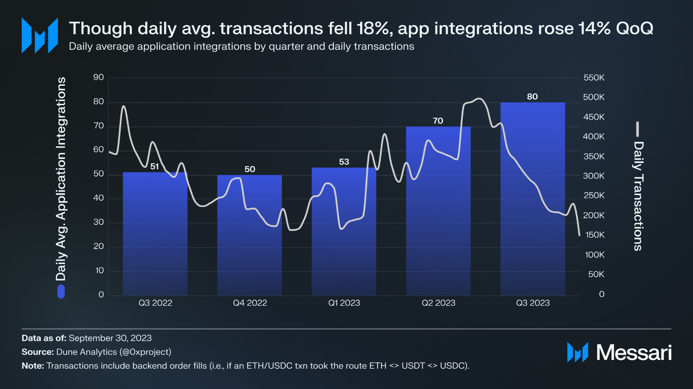 ادغام برنامههای APIهای ۰x از سهماهه چهارم ۲۰۲۲ به بعد همچنان در حال رشد است. در سهماهه دوم، تعداد برنامههایی که از ۰x استفاده میکنند ۳۲% افزایش یافت و در سهماهه سوم، دوباره افزایش یافت - این بار ۱۴%، به ۸۰ ادغام رسید. با وجود افزایش در ادغامها، میانگین معاملات روزانه ۱۸% کاهش یافت، که نشاندهنده رکود در استفاده عمومی از رمزنگاری است. اگر رمزنگاری به بهبود در شرایط بازار مطلوب ادامه دهد، ۰x آماده خواهد بود تا فعالیت و استفاده را هنگامی که در برنامههای بیشتری ادغام میشود، به خود جلب کند.