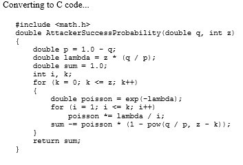 p = احتمال اینکه یک گره صادق بلوک بعدی را پیدا کن د q = احتمال اینکه مهاجم بلوک بعدی را پیدا کن د qz = احتمال اینکه مهاجم هرگز از z بلوک عق بافتاده دست پیدا کند.