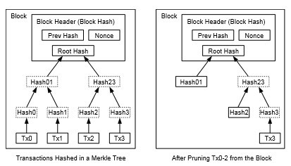 هنگامی که آخرین تراکنش در یک سکه زیر تعداد کافی بلوک ها دفن شود، تراکنش های خرجشده قبل از آن میتوانند برای صرفه جویی در فضای دیسک حذف شوند. برای تسهیل این کار بدون شکستن هش بلوک، تراکن شها در یک درخت مرکل] 7[]2[]5[ هش میشوند، با فقط ریشه آن که در هش بلوک گنجانده میشود .