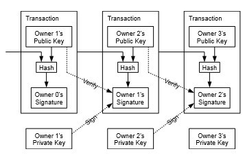 ما یک سکه الکترونیکی را به عنوان یک زنجیره از امضاهای دیجیتال تعریف میکنیم. هر صاحب سکه، آن را به صاحب بعدی منتقل میکند با امضای دیجیتالی هش تراکنش قبلی و کلید عمومی صاحب بعدی و اضافه کردن اینها به انتهای سکه. یک گیرنده میتواند امضاها را بررسی کند تا زنجیره مالکیت را تایید کند.