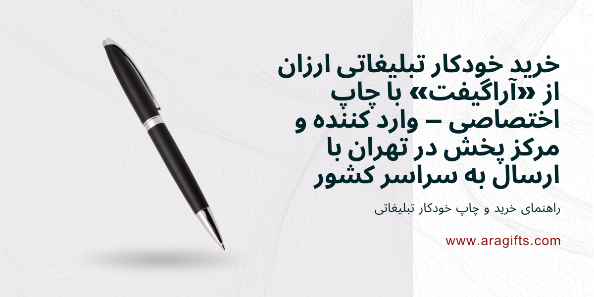 اگر به دنبال خرید خودکار تبلیغاتی ارزان قیمت برای کمپین های گسترده هستید یا می خواهید مدیران و مشتریان VIP را با خودکار تبلیغاتی لوکس تحت تأثیر قرار دهید، «آراگیفت» همراه شما است؛ وارد کننده و مرکز پخش خودکار تبلیغاتی در تهران، با امکان ارسال به سراسر کشور.
