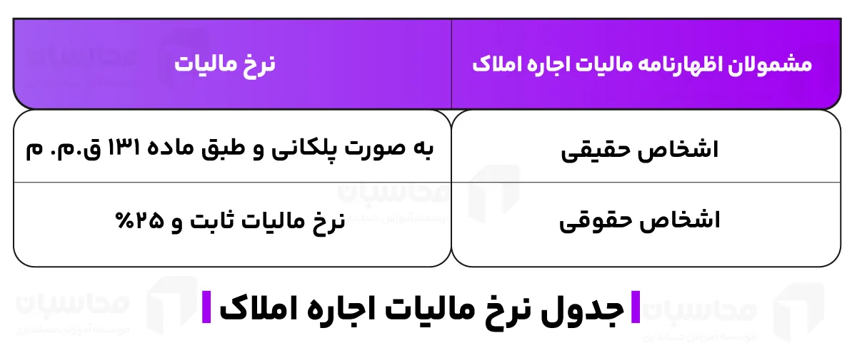 برای اشخاص حقوقی (شرکتها): نرخ مالیات بر درآمد اجاره ثابت و 25% است.