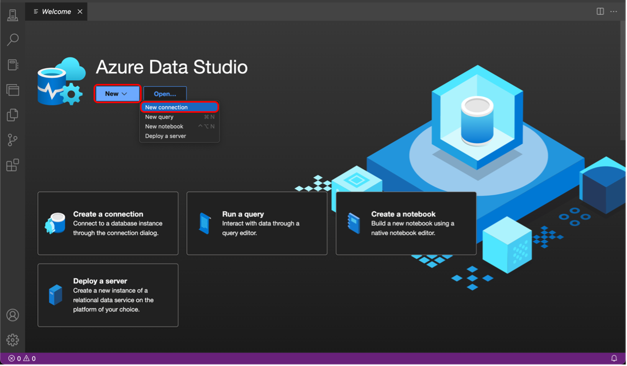 Azure Data Studio را باز کرده و روی New Connection کلیک کنید.