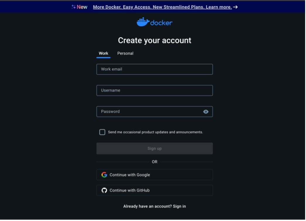 اگر حساب Docker ندارید، روی Sign Up کلیک کنید و یکی از روشهای زیر را انتخاب کنید: