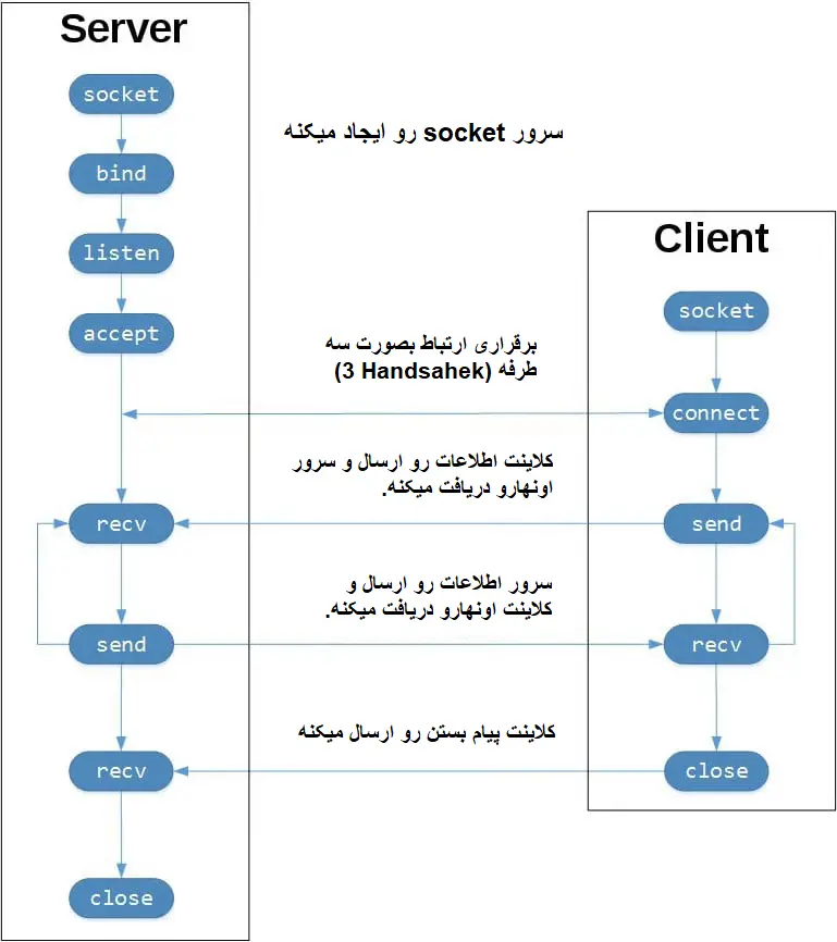 زمانی که ارتباط بین دو سوکت برقرار میشه، باید با متدهای send و recv بسته هایی رو ارسال و دریافت کنیم و بعد از اتمام کار، با متد close سوکت رو ببندیم.