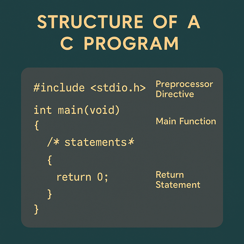 ساختار این تابع به چه شکله؟ قبل از اسم تابع نوشتم int و یعنی این تابع یه عدد integer برمیگردونه (توی پایتون نیازی نیست نوع بازگشتی تابع رو مشخص کنی اما توی C اجباریه) و معمولا عدد 0 برای نشون دادن اینکه برنامه درست اجرا شده برمیگرده.
