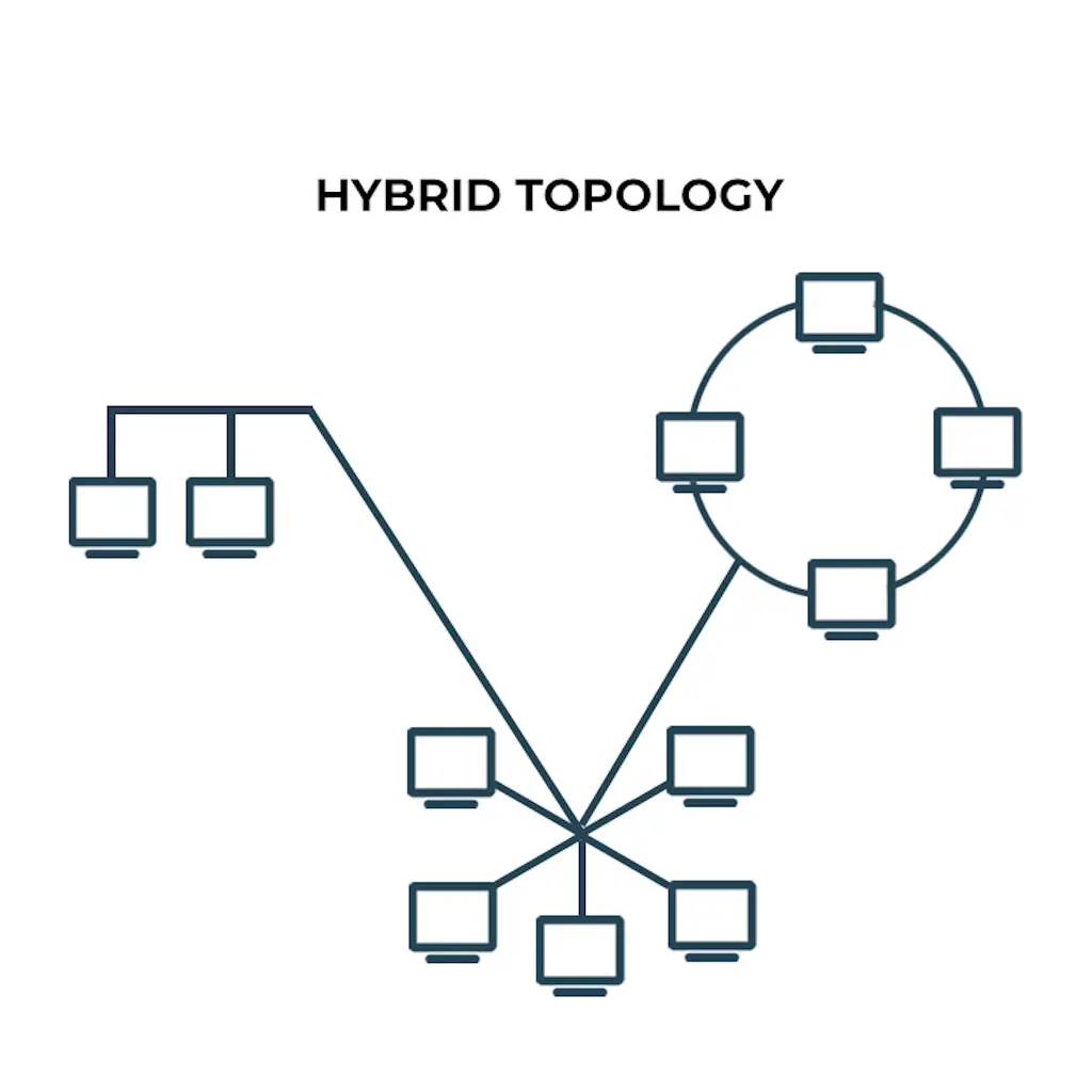 Hybrid Topology: من یه شرکت دارم با بخش های مختلف. هربخش یک شبکه داره با توپولوژی متفاوت. برای مثال بخش مالی شرکتم توپولوژی STAR داره و بخش مدیریت شرکتم توپولوژی MESH. اگه من این شبکهها رو بهم متصل کنم، به شبکه یا توپولوژی که درنهایت ساخته میشه، Hybrid یا ترکیبی میگیم. یعنی یک شبکه که از چندین توپولوژی مختلف تشکیل شده.