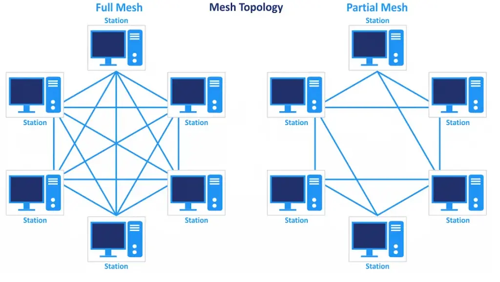 MESH Topology: تو این مدل کامپیوترها ارتباط مستقیم با دیگر کامپیوترها دارن. یعنی خبری از دستگاه مرکزی یا کابل اصلی (مثال BUS) وجود نداره. توپولوژی MESH به دو نوع Full و Half تقسیم میشه.