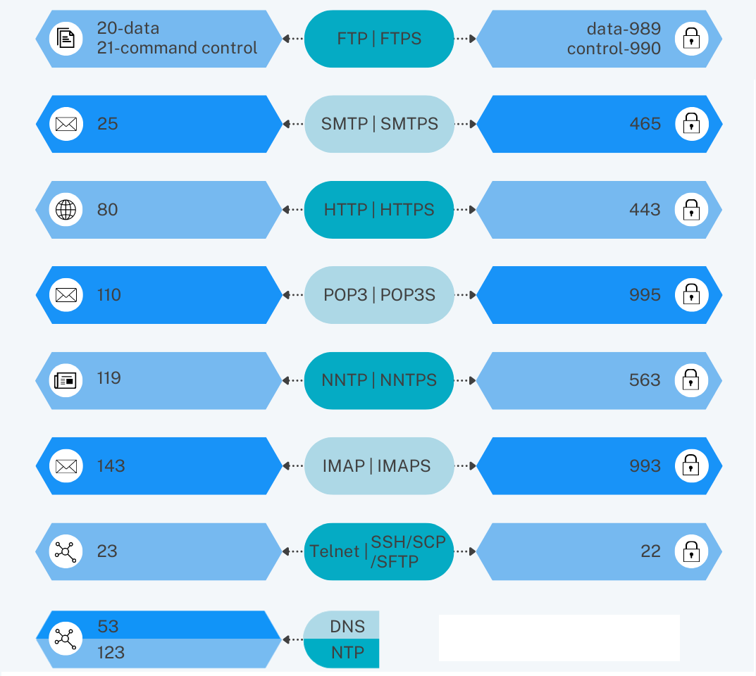 پورت شماره 0 تا 1023 به عنوان پورت های معروف و رزرو شده شناخته میشن. اکثر سرویسها روی یکی از این پورتها وجود دارن. برای مثال پروتکل HTTP که برای سرویس وب استفاده میشه، با پورت 80 کار میکنه. یا پروتکل HTTPS که اینم برای سرویس وب هست، روی پورت 443 کار میکنه. بیا فرض کنیم که IP سرور گوگل 10.20.30.40 هست. من اگه بخوام سایت گوگل رو ببینم، توی مرورگر فقط آدرس سایت رو مینویسم، کامپیوتر خودش میره آدرس گوگل رو پیدا میکنه، و به پورت 443 اون درخواستم رو میفرسته. این درخواست به شکل 10.20.30.40:443 شناخته میشه.