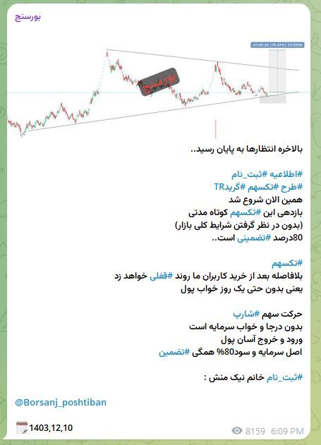 مجدد در گروه اعلام شد که یک سهم رانتی و ناب که با سهامدار هم کامل هماهنگ شده قراره معرفی بشه و از روز معرفی تا عید ۱۴۰۴ حداقل ۸۰٪ سود میده بودن در نظر گرفتن شرایط بازار (ینی اگه کل بازار منفی باشه این سهم صف خرید و مثبته)